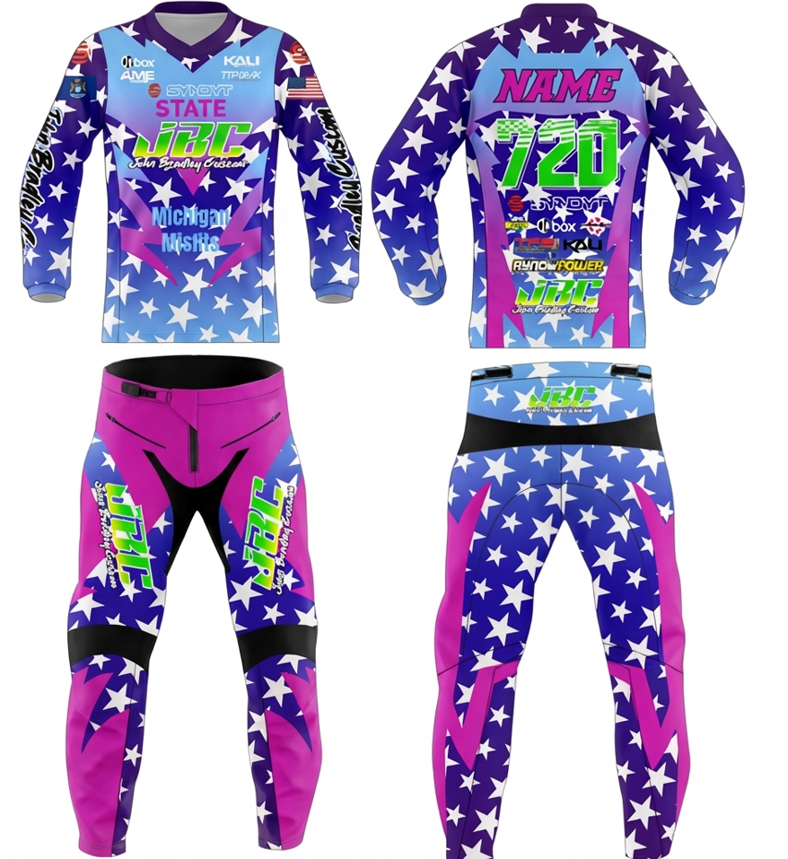 Our Jerseys are made with with fade free sublimated graphics and design with moisture wicking polyester fabric.  They are vented along the side of the body and underneath the arms that allows an improved air flow and designed by riders that love that athletic fit.
