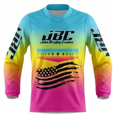 Our Jerseys are made with with fade free sublimated graphics and design with moisture wicking polyester fabric.  They are vented along the side of the body and underneath the arms that allows an improved air flow and designed by riders that love that athletic fit.